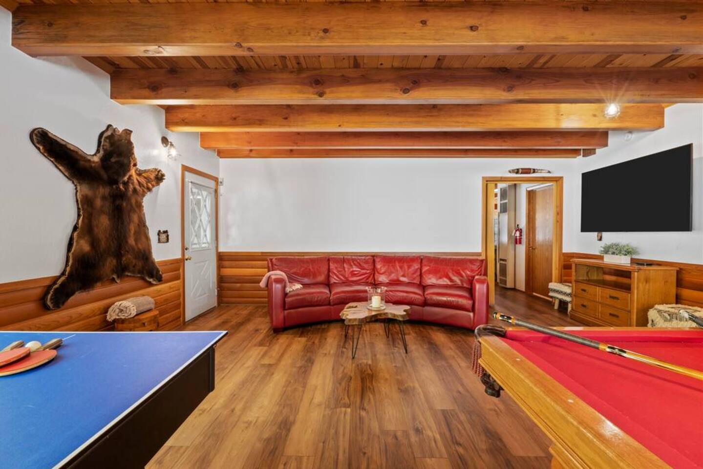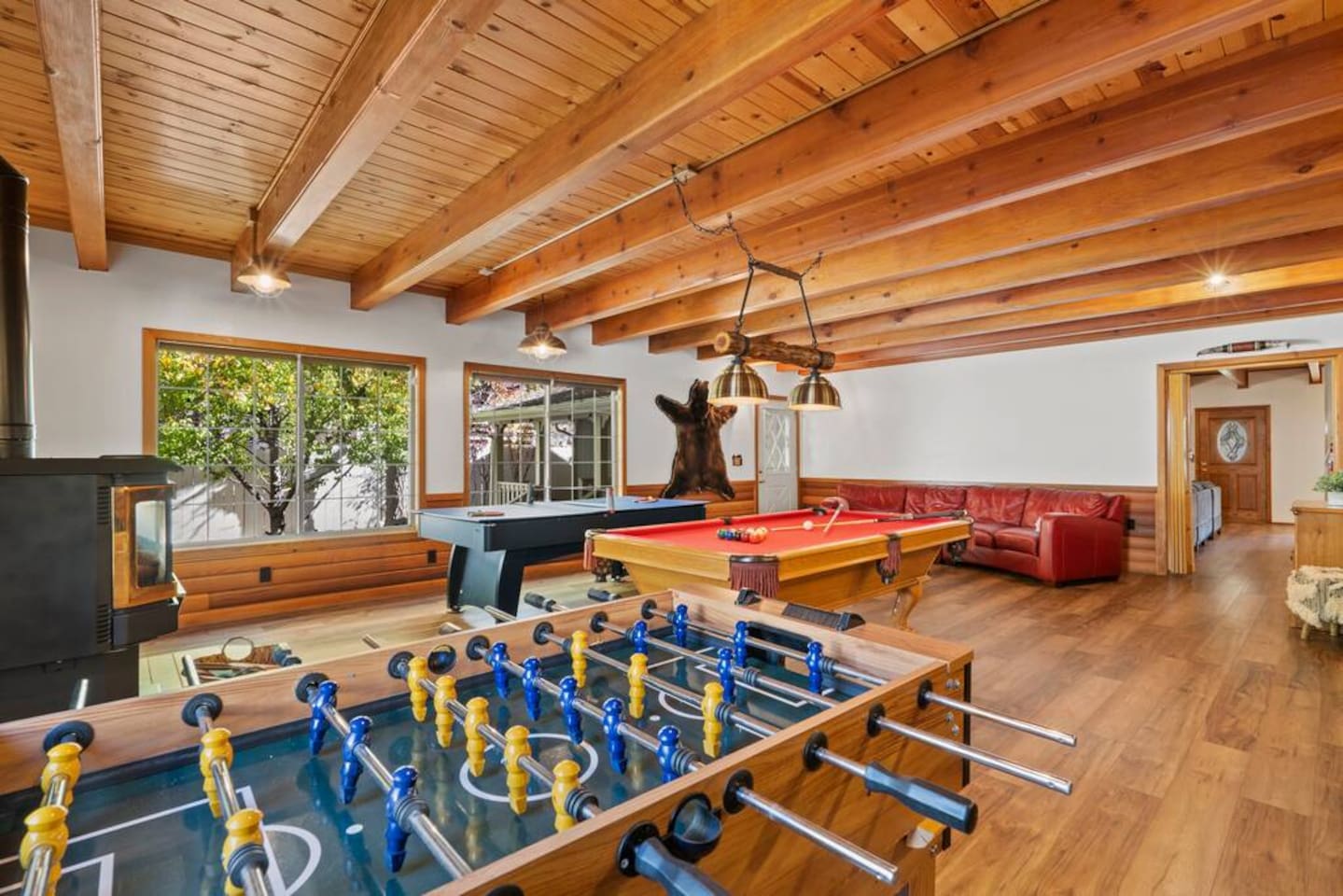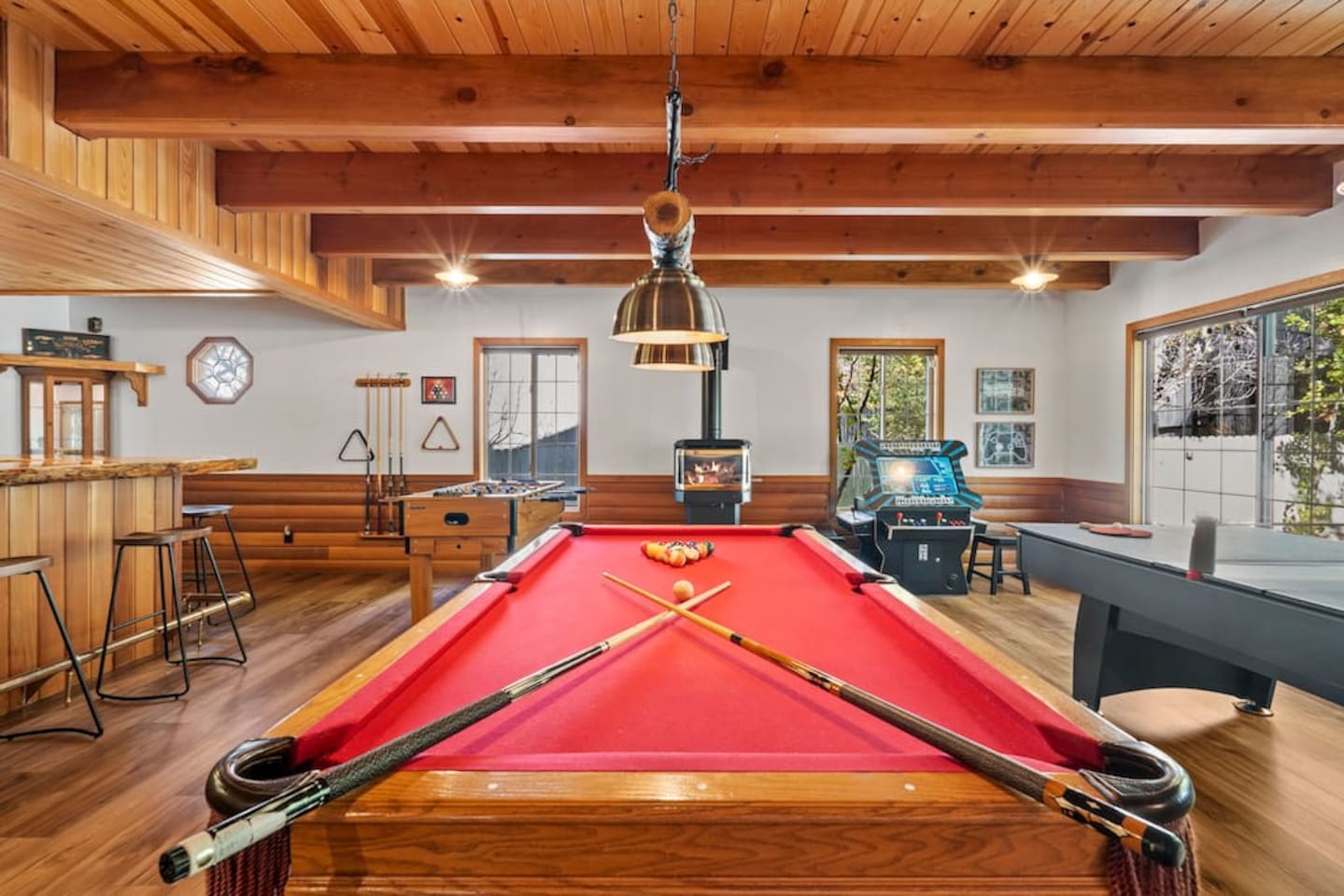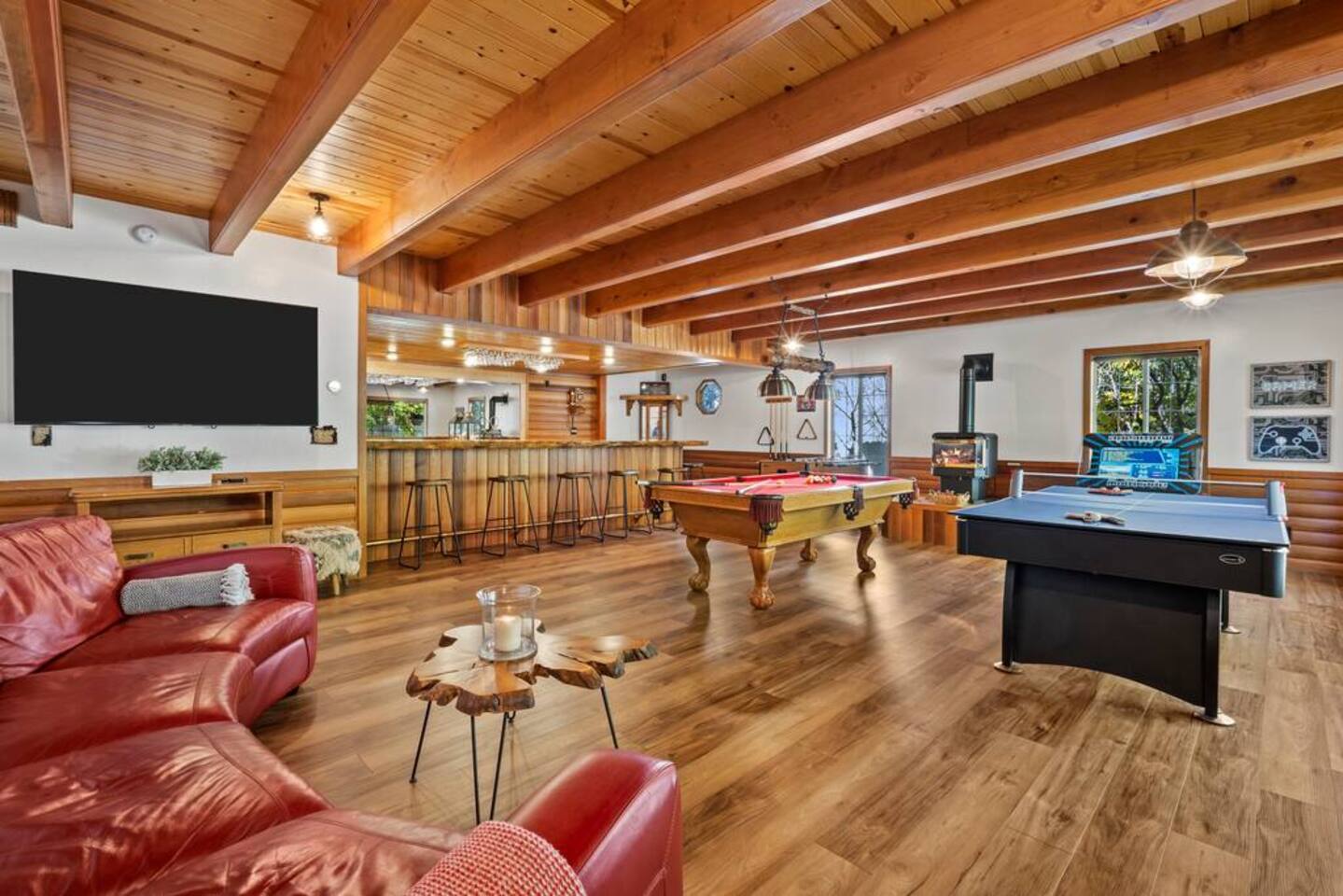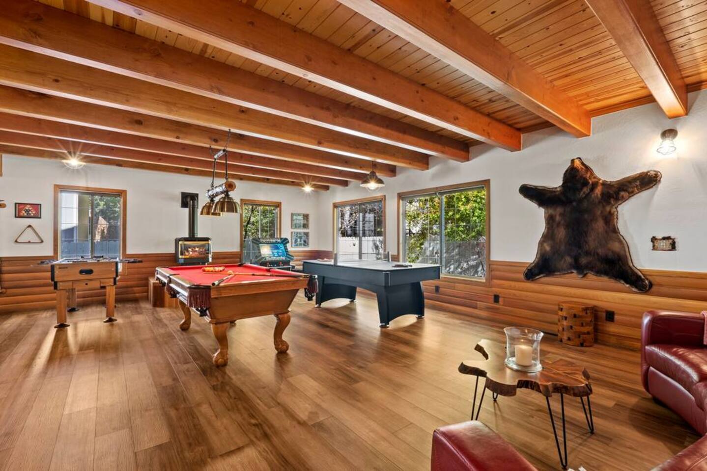 LIVING SPACE – Enjoy 3,000+ sq. ft. of comfort with a cozy living room, dining area, bar seating, and a stunning wood-burning fireplace. Relax on plush seating, perfect for gathering with family and friends. Located in the prestigious Fox Farm community, you're just minutes from Big Bear Lake, hiking trails, golf courses, and the charming shops and restaurants of Big Bear Lake Village. This spacious home offers the ideal blend of mountain charm and modern convenience. 5 BEDROOMS & 3 BATHROOMS (All Bedrooms are on the 2nd floor) ★ 1st bedroom has has a king bed. ★ 2nd bedroom has a king bed. ★ 3rd bedroom has a King bed. ★ 4th bedroom has a 2 Queen Beds ★ 5th bedroom has 4 twin beds (Bunk bed w 2 twin beds + additional 2 twin beds) Extra blankets and pillows are available. AMENITIES ★ 2 smart TVs ★ fast WiFi ★ dedicated work space. EXTRA LARGE GAME ROOM ★ Game Room with BAR ★ Pool Table ★ Foosball ★ Ping-Pong ★ 100+ Arcade games ★ Board games Monopoly and more ★ Classic arcade table has 412 games! (Pac-Man, Ms Pac-Man, Donkey Kong, Galaga, etc.) ★Various board games & puzzles KITCHEN ★ Kitchen island for everyone to gather together ★Fully equipped & stocked kitchen ★ 5 burner stove with griddle and oven ★ 2 refrigerators ★ dishwasher ★ new stainless steel appliances ★microwave, blender, toaster ★ coffee maker ★ dishes, pots/pans ★ spice rack, and more Other amenities: ★Central AC + Heating ★ Onsite Laundry Room with Washer + Dryer ★ Parking → garage (2 cars) + 4 car driveway ★ Level 2 EV charger* (Tesla drivers need to bring their own adapter) ★ Dedicated workspace ★ 65" Smart TV w/ Netflix ★ Indoor gas fireplace ★ Dedicated work space ★ FREE Wifi OUTDOOR AMENITIES ★ Fully fenced backyard ★ Large front and back deck ★ "Big Bear Lake style outdoor furniture" ★ Gas Grill ★ Travel size starter kit of shampoo, conditioner & soap provided. ★ Hot tub (additional $45/day)