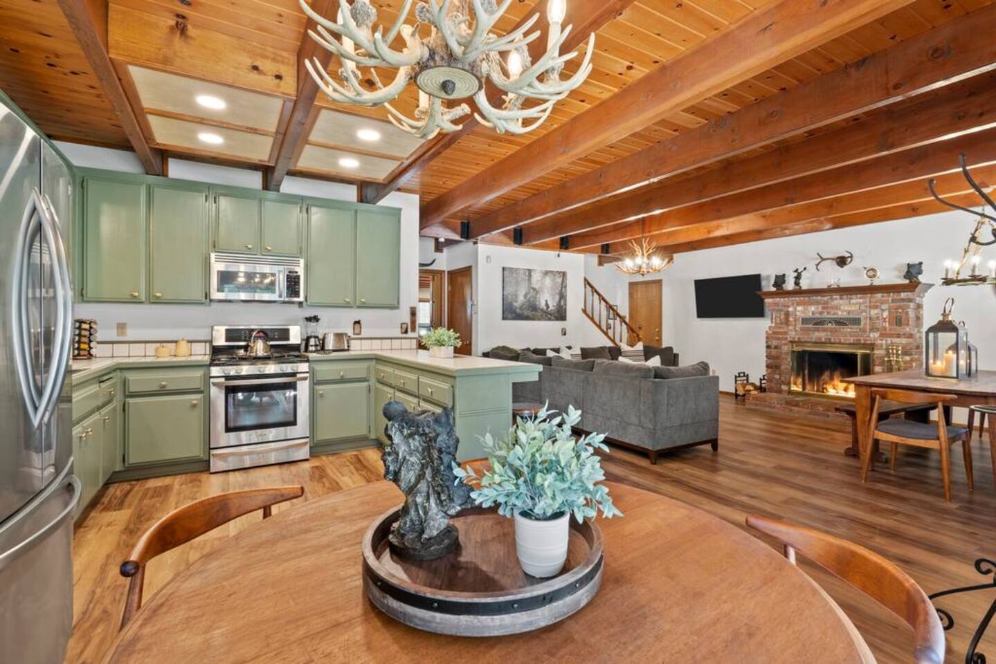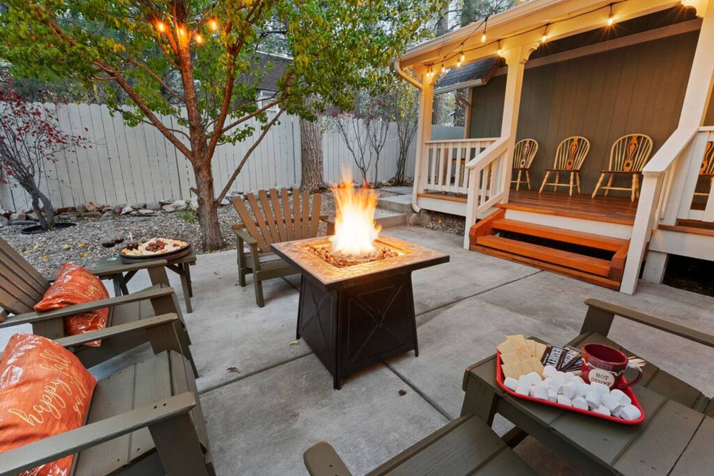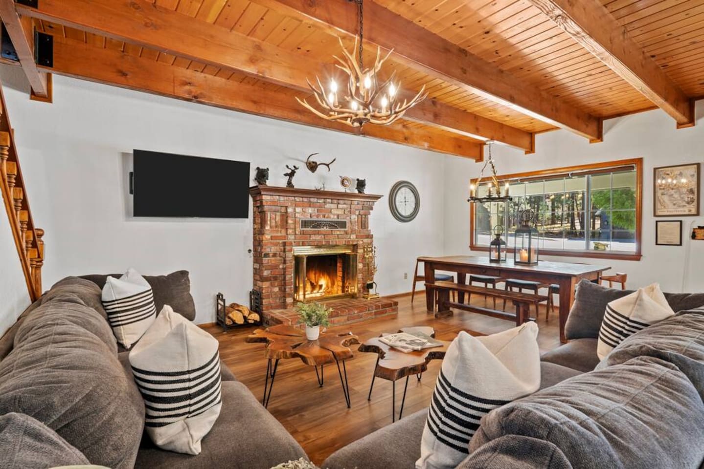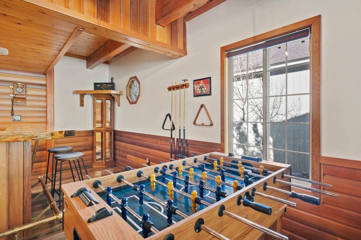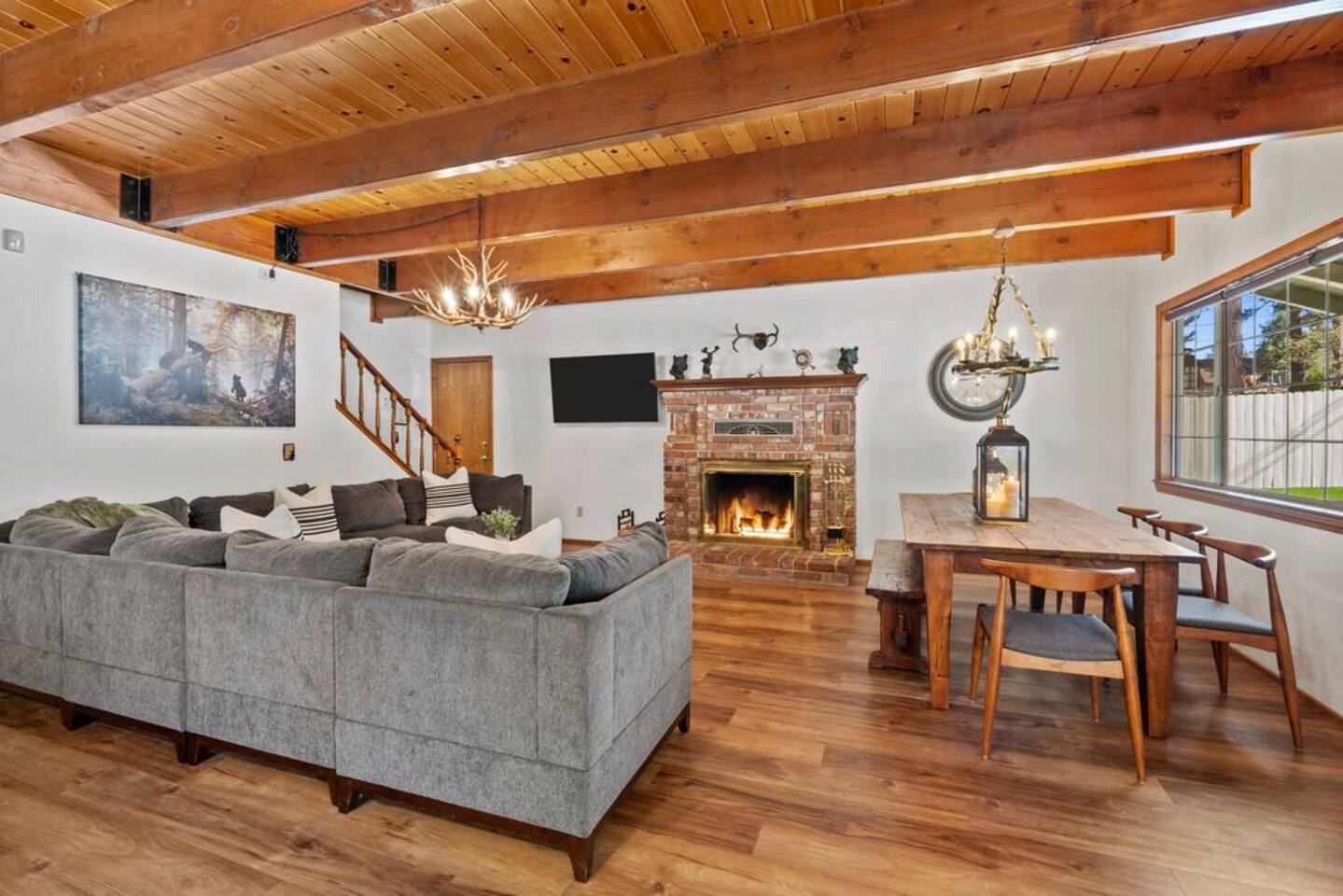 LIVING SPACE – Enjoy 3,000+ sq. ft. of comfort with a cozy living room, dining area, bar seating, and a stunning wood-burning fireplace. Relax on plush seating, perfect for gathering with family and friends. Located in the prestigious Fox Farm community, you're just minutes from Big Bear Lake, hiking trails, golf courses, and the charming shops and restaurants of Big Bear Lake Village. This spacious home offers the ideal blend of mountain charm and modern convenience. 5 BEDROOMS & 3 BATHROOMS (All Bedrooms are on the 2nd floor) ★ 1st bedroom has has a king bed. ★ 2nd bedroom has a king bed. ★ 3rd bedroom has a King bed. ★ 4th bedroom has a 2 Queen Beds ★ 5th bedroom has 4 twin beds (Bunk bed w 2 twin beds + additional 2 twin beds) Extra blankets and pillows are available. AMENITIES ★ 2 smart TVs ★ fast WiFi ★ dedicated work space. EXTRA LARGE GAME ROOM ★ Game Room with BAR ★ Pool Table ★ Foosball ★ Ping-Pong ★ 100+ Arcade games ★ Board games Monopoly and more ★ Classic arcade table has 412 games! (Pac-Man, Ms Pac-Man, Donkey Kong, Galaga, etc.) ★Various board games & puzzles KITCHEN ★ Kitchen island for everyone to gather together ★Fully equipped & stocked kitchen ★ 5 burner stove with griddle and oven ★ 2 refrigerators ★ dishwasher ★ new stainless steel appliances ★microwave, blender, toaster ★ coffee maker ★ dishes, pots/pans ★ spice rack, and more Other amenities: ★Central AC + Heating ★ Onsite Laundry Room with Washer + Dryer ★ Parking → garage (2 cars) + 4 car driveway ★ Level 2 EV charger* (Tesla drivers need to bring their own adapter) ★ Dedicated workspace ★ 65" Smart TV w/ Netflix ★ Indoor gas fireplace ★ Dedicated work space ★ FREE Wifi OUTDOOR AMENITIES ★ Fully fenced backyard ★ Large front and back deck ★ "Big Bear Lake style outdoor furniture" ★ Gas Grill ★ Travel size starter kit of shampoo, conditioner & soap provided. ★ Hot tub (additional $45/day)