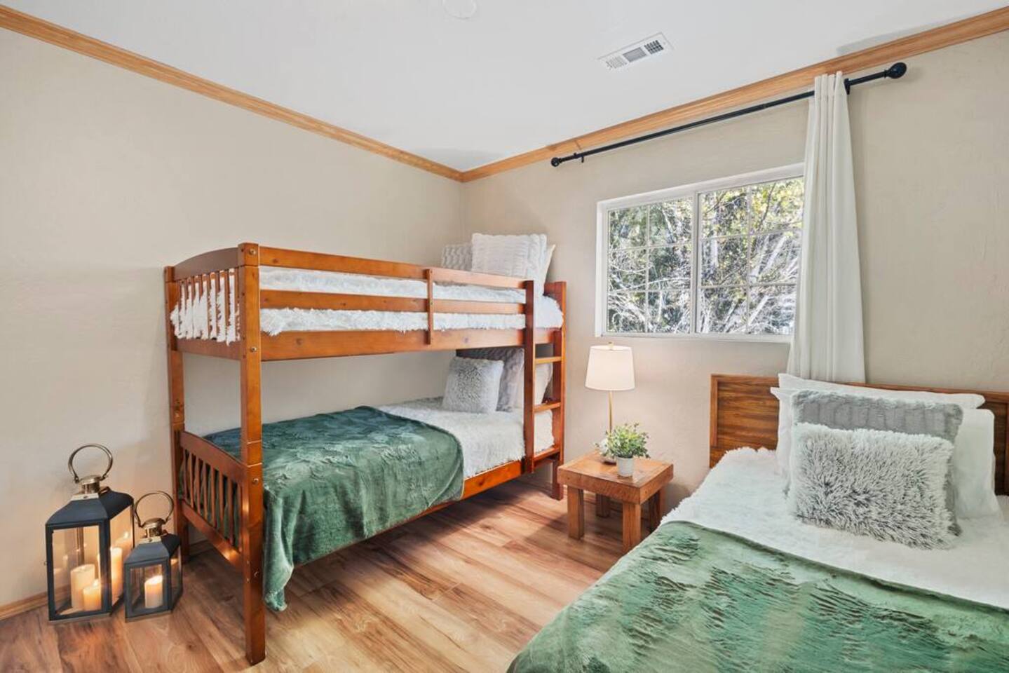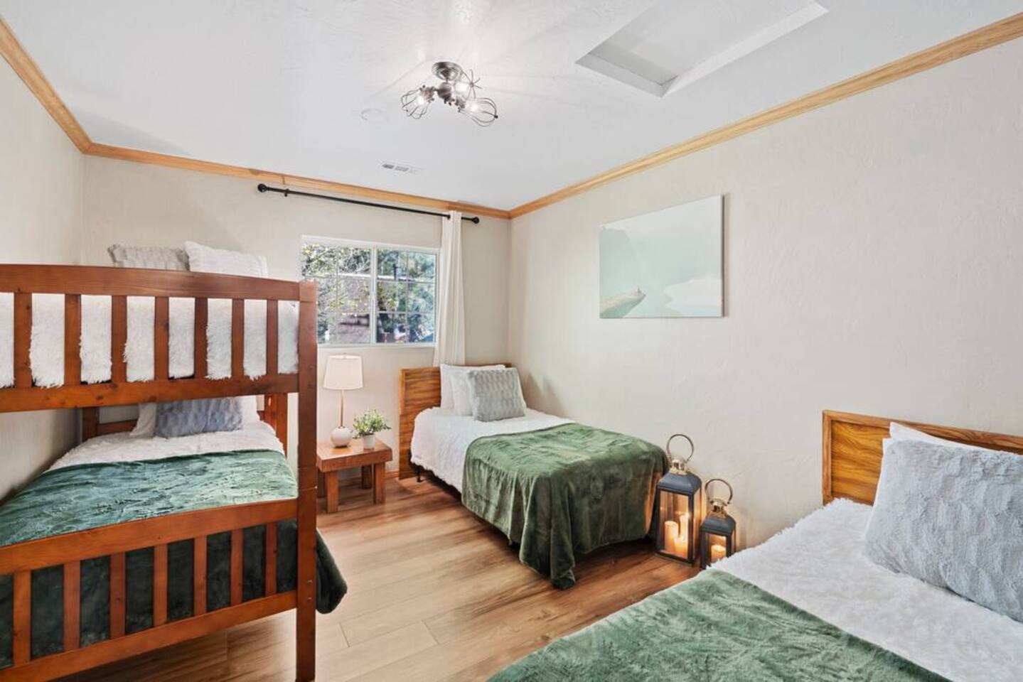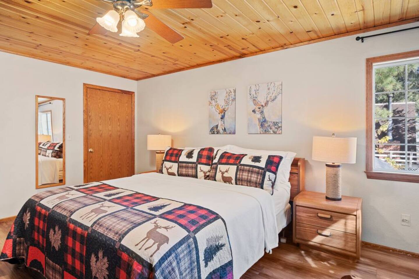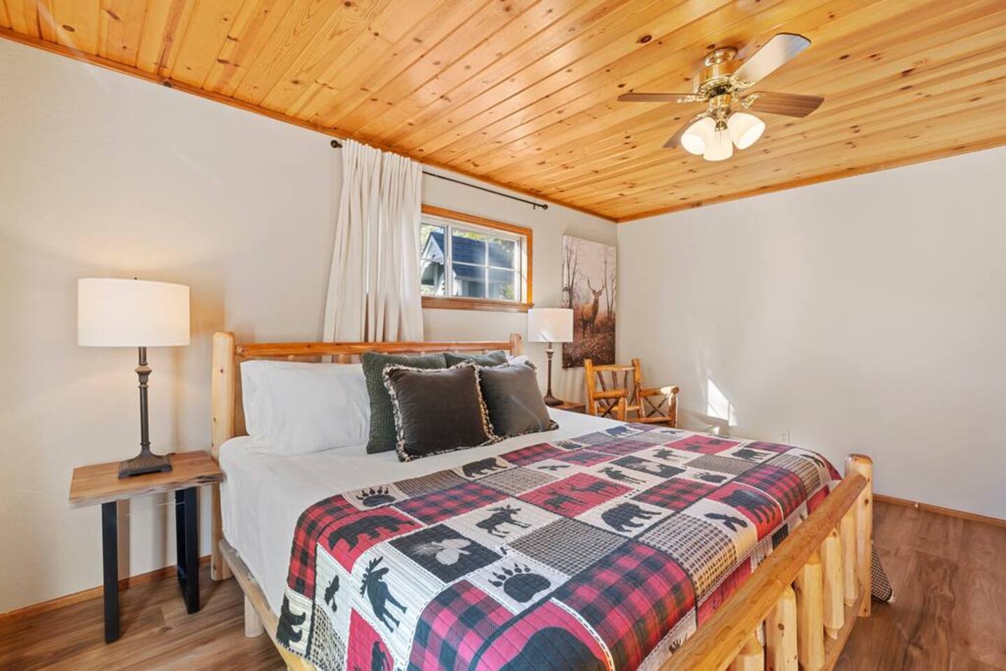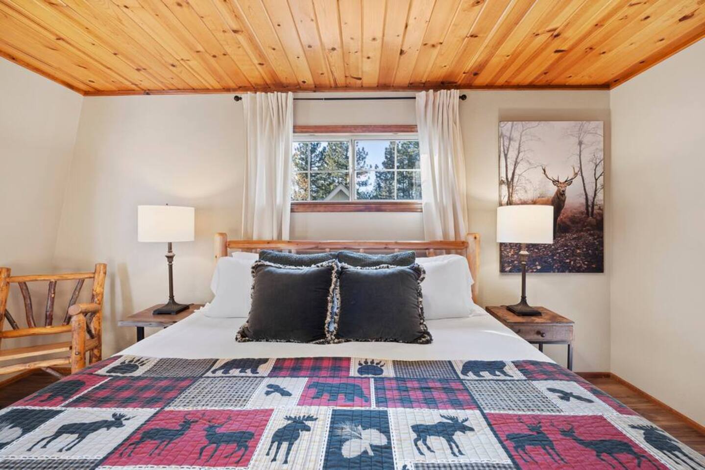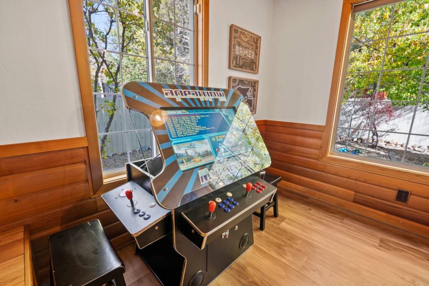 LIVING SPACE – Enjoy 3,000+ sq. ft. of comfort with a cozy living room, dining area, bar seating, and a stunning wood-burning fireplace. Relax on plush seating, perfect for gathering with family and friends. Located in the prestigious Fox Farm community, you're just minutes from Big Bear Lake, hiking trails, golf courses, and the charming shops and restaurants of Big Bear Lake Village. This spacious home offers the ideal blend of mountain charm and modern convenience. 5 BEDROOMS & 3 BATHROOMS (All Bedrooms are on the 2nd floor) ★ 1st bedroom has has a king bed. ★ 2nd bedroom has a king bed. ★ 3rd bedroom has a King bed. ★ 4th bedroom has a 2 Queen Beds ★ 5th bedroom has 4 twin beds (Bunk bed w 2 twin beds + additional 2 twin beds) Extra blankets and pillows are available. AMENITIES ★ 2 smart TVs ★ fast WiFi ★ dedicated work space. EXTRA LARGE GAME ROOM ★ Game Room with BAR ★ Pool Table ★ Foosball ★ Ping-Pong ★ 100+ Arcade games ★ Board games Monopoly and more ★ Classic arcade table has 412 games! (Pac-Man, Ms Pac-Man, Donkey Kong, Galaga, etc.) ★Various board games & puzzles KITCHEN ★ Kitchen island for everyone to gather together ★Fully equipped & stocked kitchen ★ 5 burner stove with griddle and oven ★ 2 refrigerators ★ dishwasher ★ new stainless steel appliances ★microwave, blender, toaster ★ coffee maker ★ dishes, pots/pans ★ spice rack, and more Other amenities: ★Central AC + Heating ★ Onsite Laundry Room with Washer + Dryer ★ Parking → garage (2 cars) + 4 car driveway ★ Level 2 EV charger* (Tesla drivers need to bring their own adapter) ★ Dedicated workspace ★ 65" Smart TV w/ Netflix ★ Indoor gas fireplace ★ Dedicated work space ★ FREE Wifi OUTDOOR AMENITIES ★ Fully fenced backyard ★ Large front and back deck ★ "Big Bear Lake style outdoor furniture" ★ Gas Grill ★ Travel size starter kit of shampoo, conditioner & soap provided. ★ Hot tub (additional $45/day)