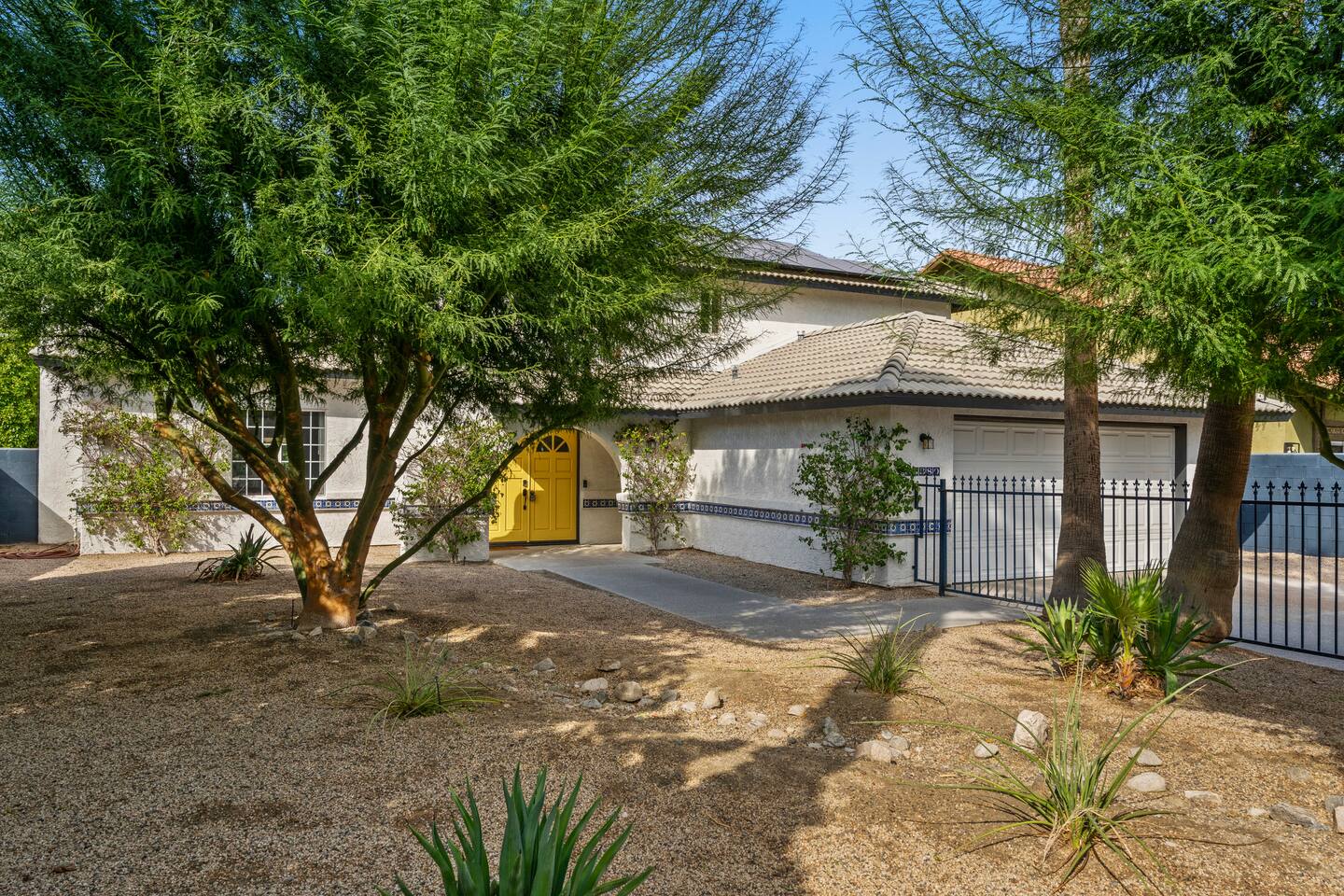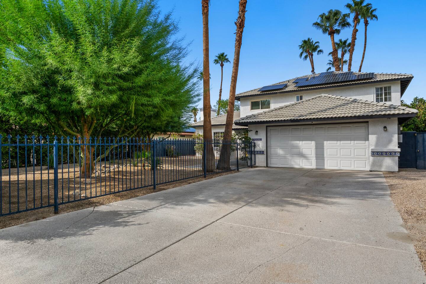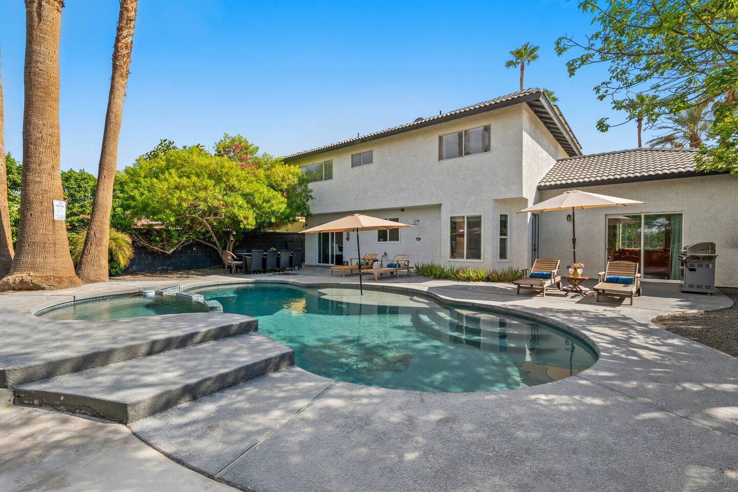 Other amenities: → Fully equipped + stocked kitchen → Central AC + Heating → Onsite brand new washer + dryer → Parking → 4 car driveway and street parking → Dedicated workspace Located in a prestigious community close to casinos, shopping, hiking, horse riding, golfing, basketball courts and minutes to all the cities in the Coachella Valley. Close proximity to all hospitals in the Desert. KITCHEN AND DINING: Available in the property: Refrigerator, Stove, Oven, Microwave, Dishwasher, Coffee maker, Toaster, Dishes Utensils, Pantry Items, fully furnished with Smart TV in the Living Room. UTILITIES: Available in the property: Central Heating & Air Conditioning, Washer, Dryer POOL & SPA FACILITIES: Available in the property: Private Pool, Hot Tub. Pool and spa heating available for additional cost* NO DIVING! Shallow pool and is not meant for diving. Please, watch your children closely in the pool. OUTDOOR FEATURES: Available in the property: Dining for 10 along with covered Gazebo with lounge furniture, Firepit, BBQ, Pool Towels, Lawn/Garden ADDITIONAL AMENITIES: Available in the property: Starter Essentials (Towels, bed sheets, toilet paper, paper towel, starter soap, shampoo, dishwasher liquid), Hair Dryer, Hangers, Gas, Indoor Fireplace PARKING: Parking for maximum of 4 cars on the driveway with first come/first serve basis. No garage parking available. Ample free street parking available.