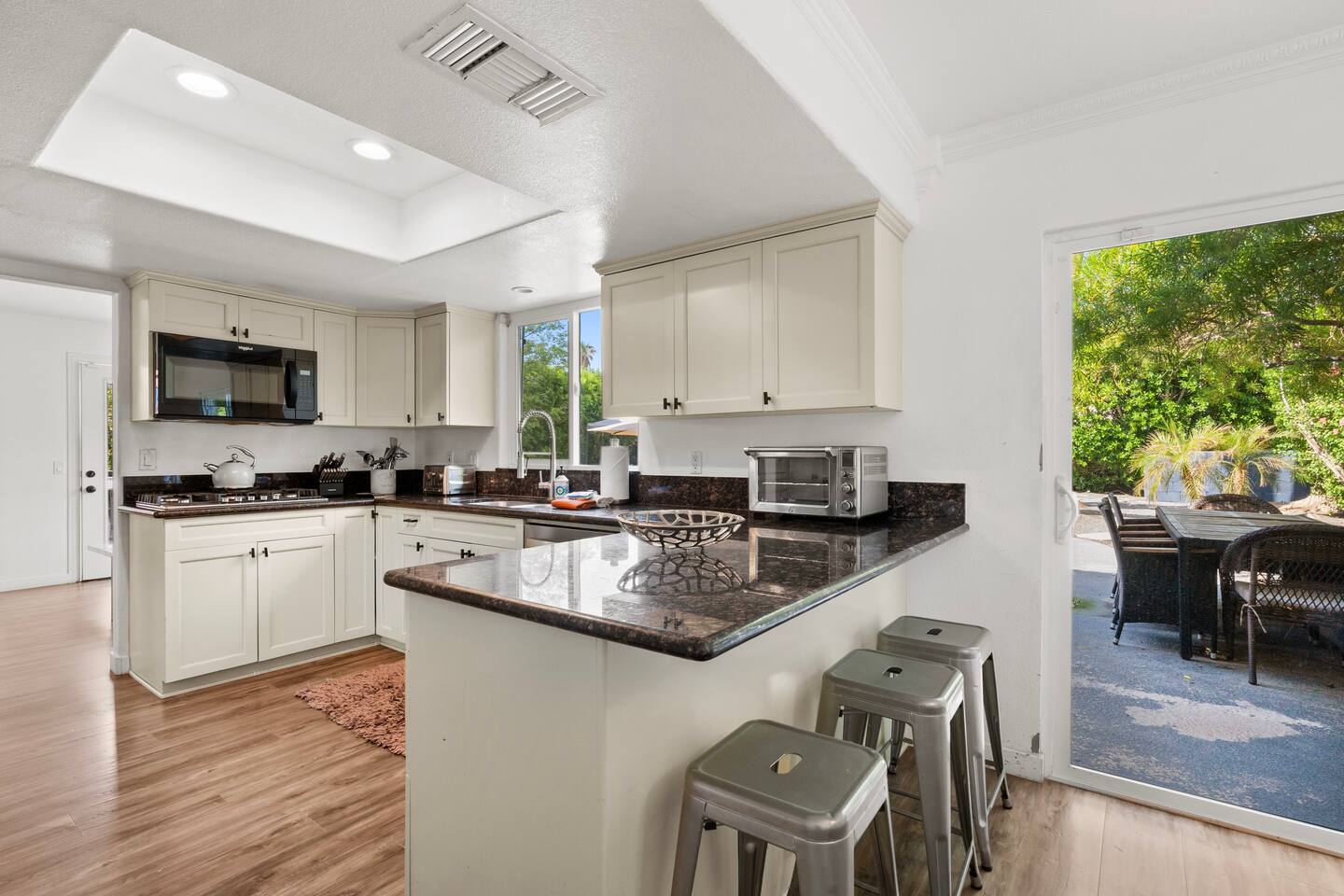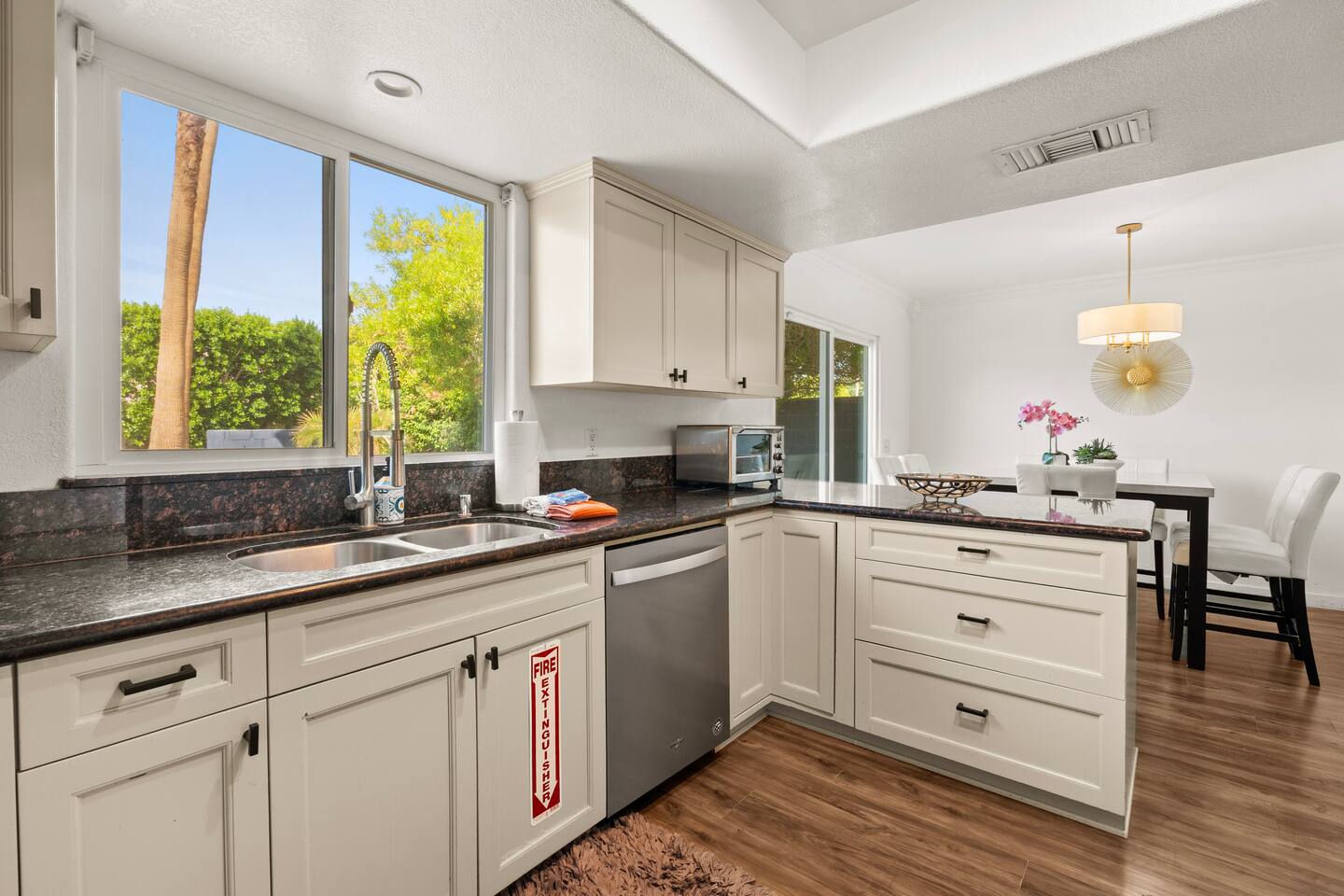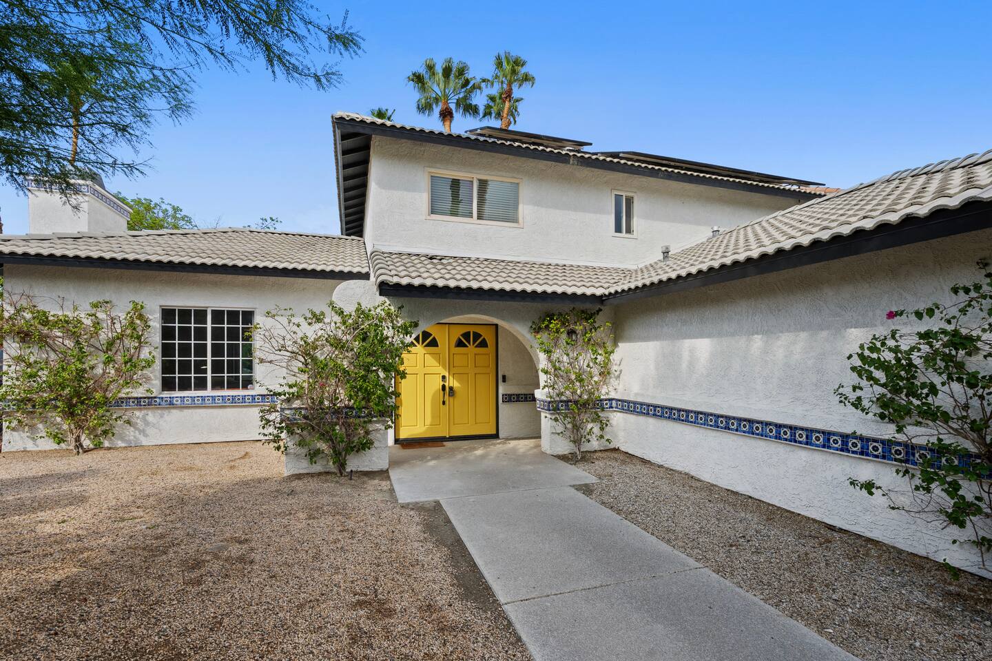 Other amenities: → Fully equipped + stocked kitchen → Central AC + Heating → Onsite brand new washer + dryer → Parking → 4 car driveway and street parking → Dedicated workspace Located in a prestigious community close to casinos, shopping, hiking, horse riding, golfing, basketball courts and minutes to all the cities in the Coachella Valley. Close proximity to all hospitals in the Desert. KITCHEN AND DINING: Available in the property: Refrigerator, Stove, Oven, Microwave, Dishwasher, Coffee maker, Toaster, Dishes Utensils, Pantry Items, fully furnished with Smart TV in the Living Room. UTILITIES: Available in the property: Central Heating & Air Conditioning, Washer, Dryer POOL & SPA FACILITIES: Available in the property: Private Pool, Hot Tub. Pool and spa heating available for additional cost* NO DIVING! Shallow pool and is not meant for diving. Please, watch your children closely in the pool. OUTDOOR FEATURES: Available in the property: Dining for 10 along with covered Gazebo with lounge furniture, Firepit, BBQ, Pool Towels, Lawn/Garden ADDITIONAL AMENITIES: Available in the property: Starter Essentials (Towels, bed sheets, toilet paper, paper towel, starter soap, shampoo, dishwasher liquid), Hair Dryer, Hangers, Gas, Indoor Fireplace PARKING: Parking for maximum of 4 cars on the driveway with first come/first serve basis. No garage parking available. Ample free street parking available.